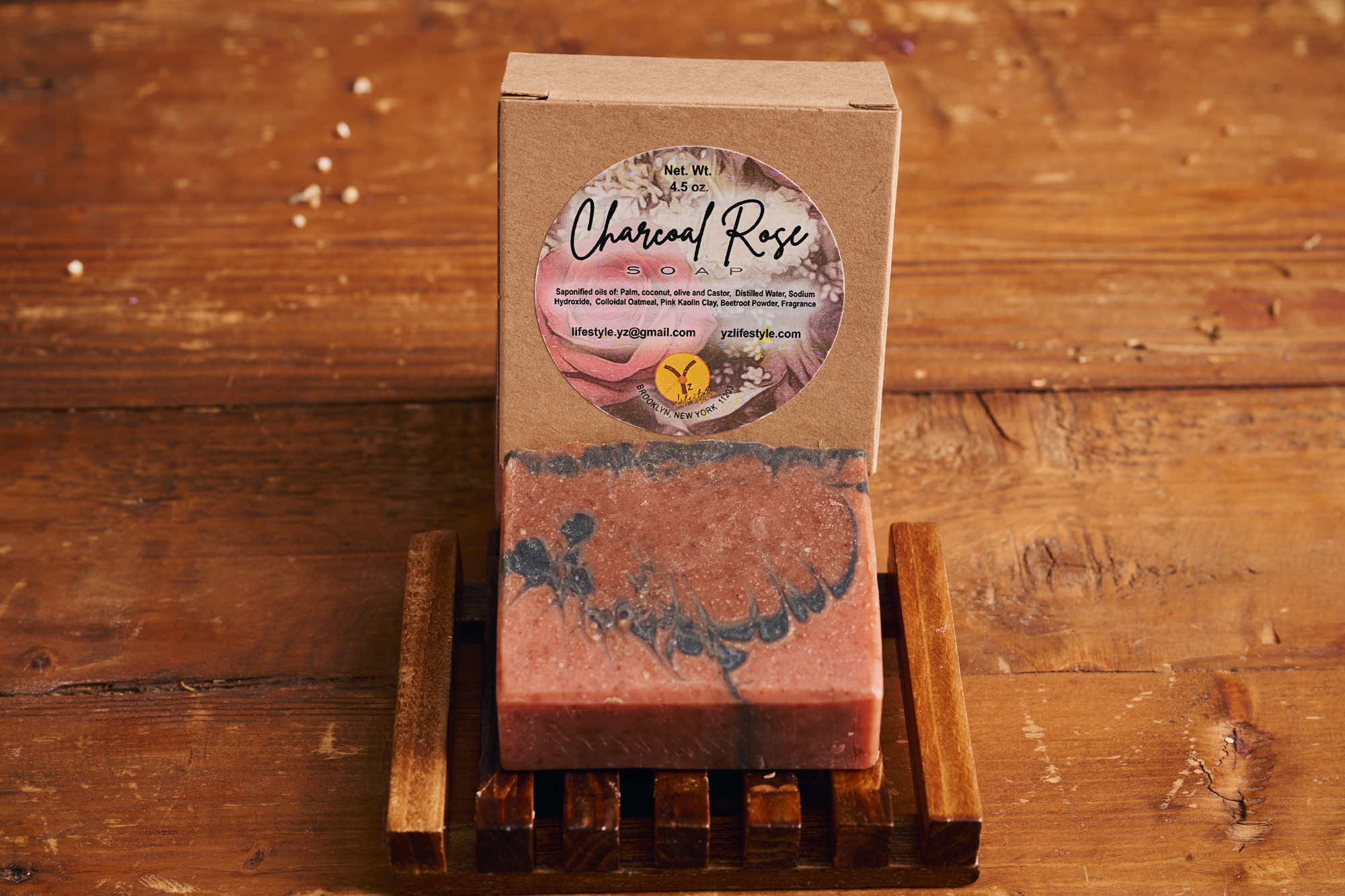 Ingredients: Saponified oils of: Palm, coconut, olive and Castor, Distilled Water, Sodium Hydroxide, Colloidal Oatmeal, Pink Kaolin Clay, Beetroot Powder, Fragrance